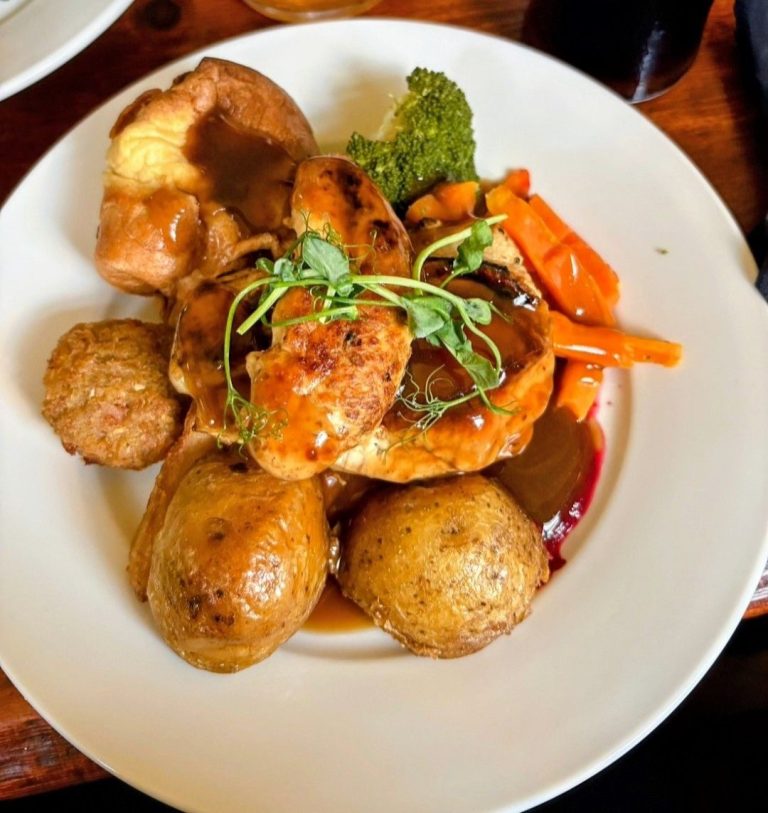 With buttered mash, roast potatoes, homemade Yorkshire pudding, stuffing, accompanied by seasonal vegetables.